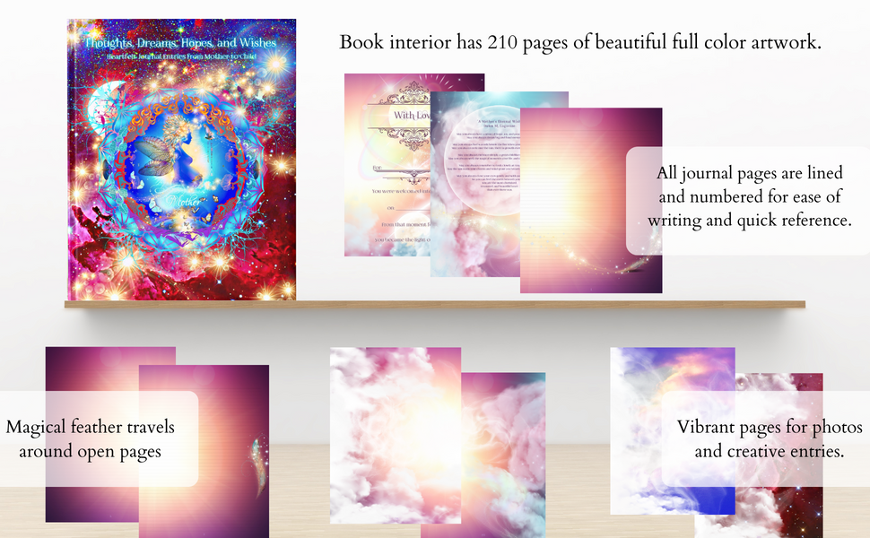 As the child grows all of the mother's thoughts, dreams, hopes, and wishes can be preserved to later be gifted as a special keepsake. It's a piece of the proverbial heart captured on paper and protected with love deep within this magical book!
